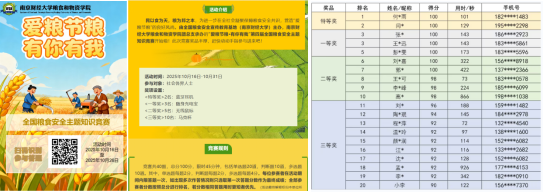 为进一步在全社会凝聚保障粮食安全共识,由全国粮食安全宣传教育基地(南京财经大学)主办,南京财经大学粮食和物资学院承办的“爱粮节粮·有你有我”全国粮食安全主题知识竞赛活动于10月16日开展,至30日圆满落下帷幕。活动自启动以来,得到了社会各界人士的大力支持和广泛参与,共有百余人次参与答题。本次知识竞赛活动题目紧紧围绕国家粮食安全主题,提升了公众对粮食安全重要性的认识,取得了较好的宣教效果。