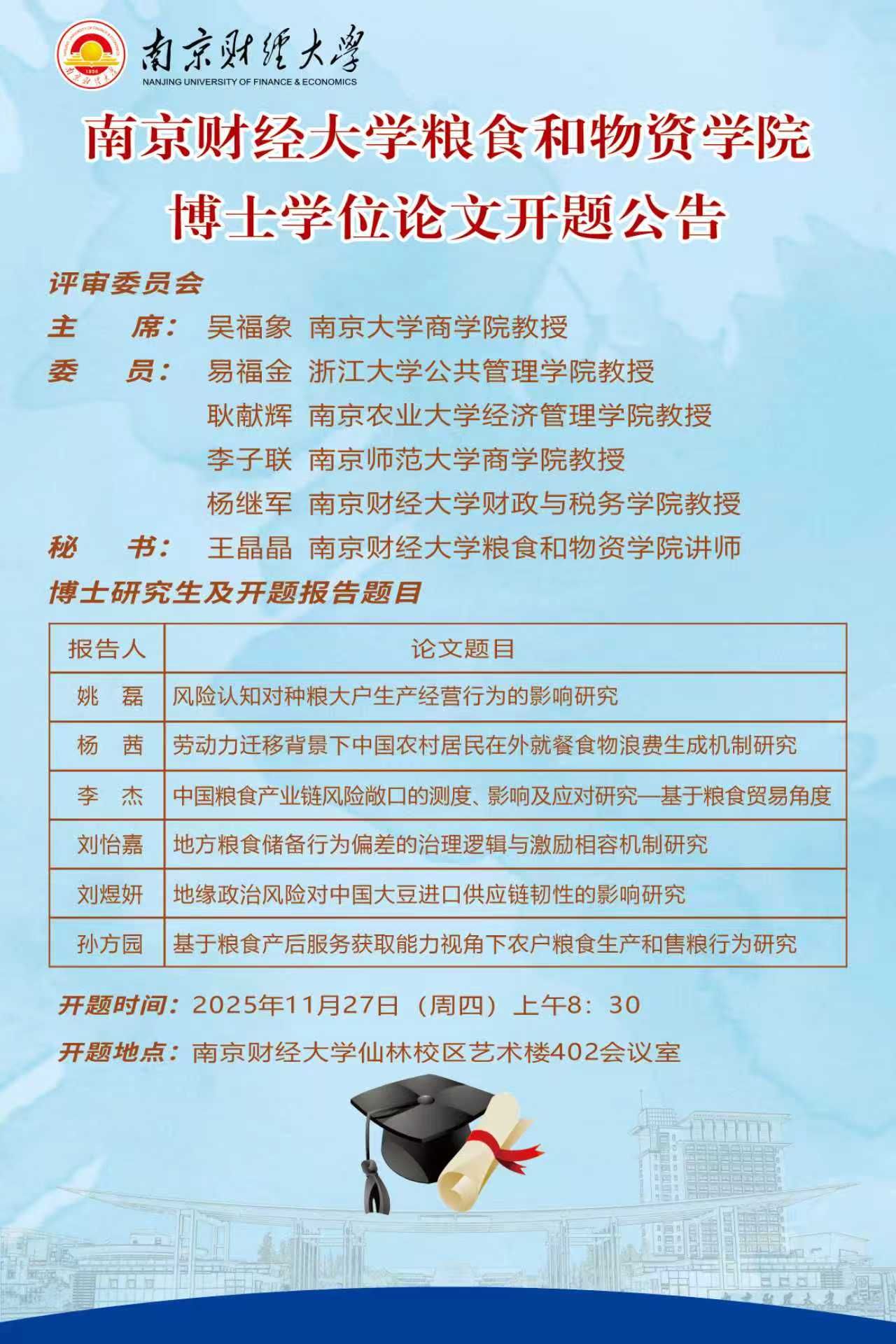 南京财经大学粮食和物资学院博士学位论文开题公告
